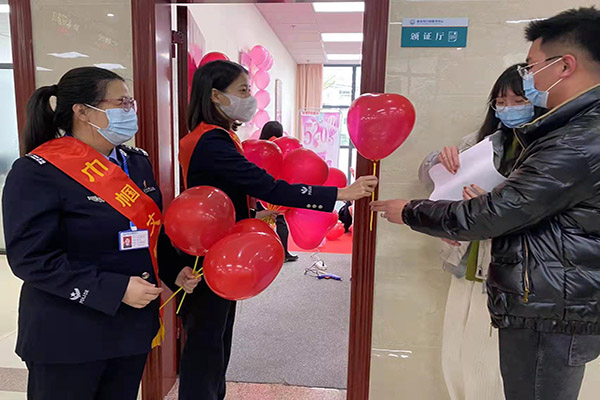 二是配齐人员。在服务力量上配合行政服务大厅疫情防控工作要求执行,认真做好每一个细节,从局机关抽调人员,组织青年志愿服务队、巾帼志愿服务队进行现场有序引导,对已经预约且提交资料的当事人进行材料预审,减少当事人现场等候时间,整个侯登大厅井然有序,窗口内工作人员个个礼仪有佳,以饱满的热情迎接前来办理的新人,窗口外新人们拿着登记处精心准备的爱心气球耐心等候。